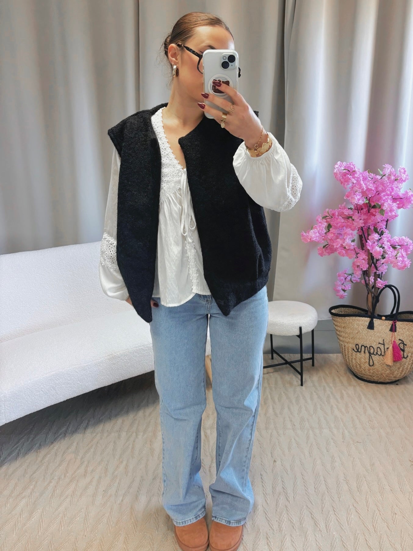 Astuce style : porte ta veste fluffy sans manches sur une blouse, un pull ou même un sweat pour créer un look cosy et tendance en toute simplicité.